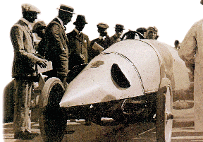 the Brooklands circuit in England with a highly aerodynamic racing car, powered